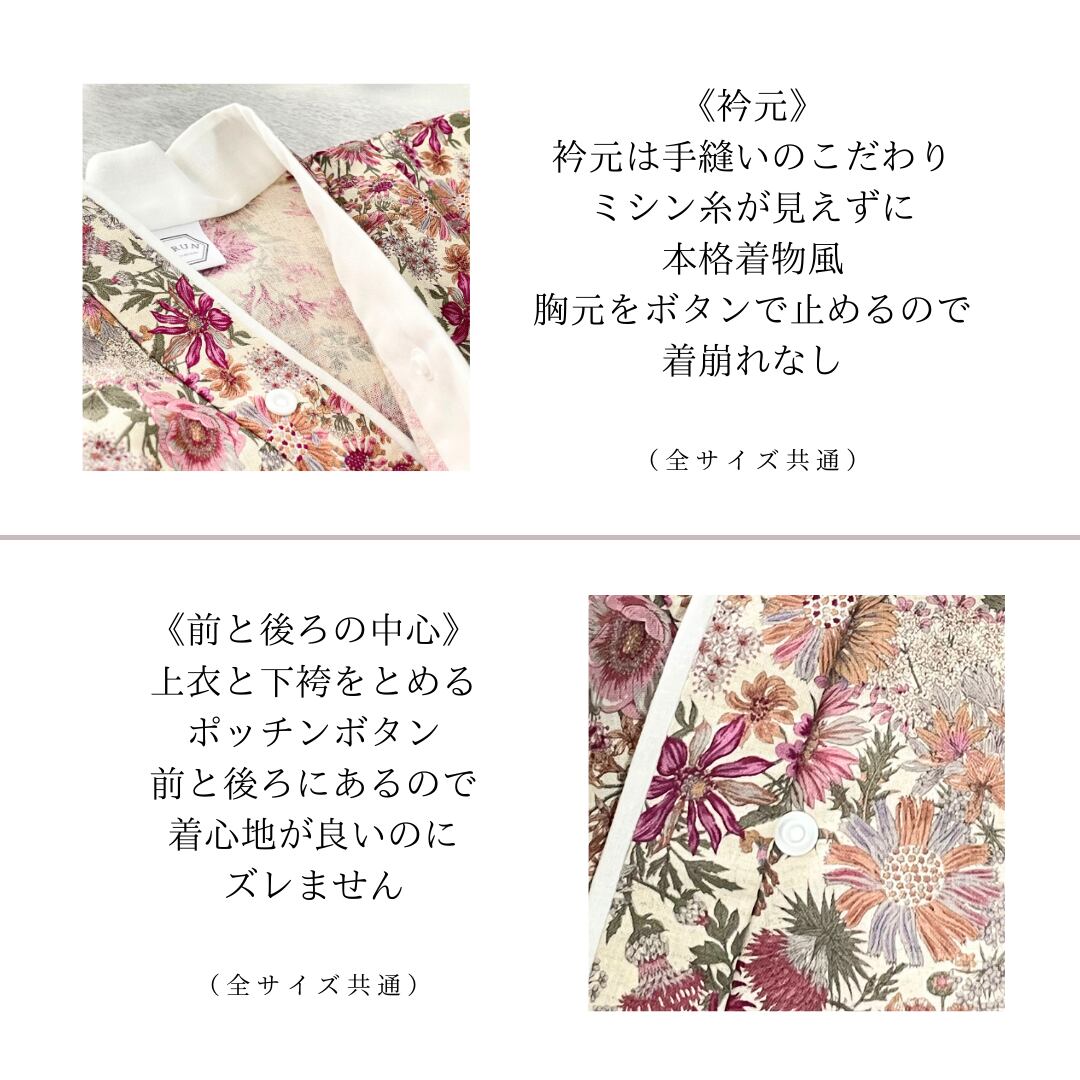 プラスチックボタンを2箇所留めるだけの簡単仕様なので、着物に慣れていなくても安心です。自然と左前(左上前)になるように仕立てており、どなたでもきれいに着せていただけます。